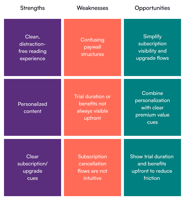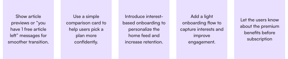 I analyzed Medium, Substack, Inkl, The New York Times, and The Atlantic to understand how leading platforms balance free and premium access. This audit revealed different strategies for onboarding, upgrade prompts, and value communication. For example, some platforms emphasized free trials to reduce hesitation, while others highlighted premium benefits upfront or personalized content to drive engagement.